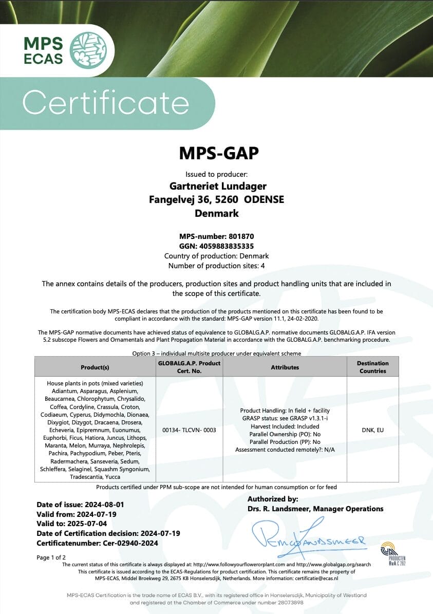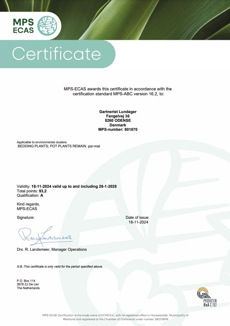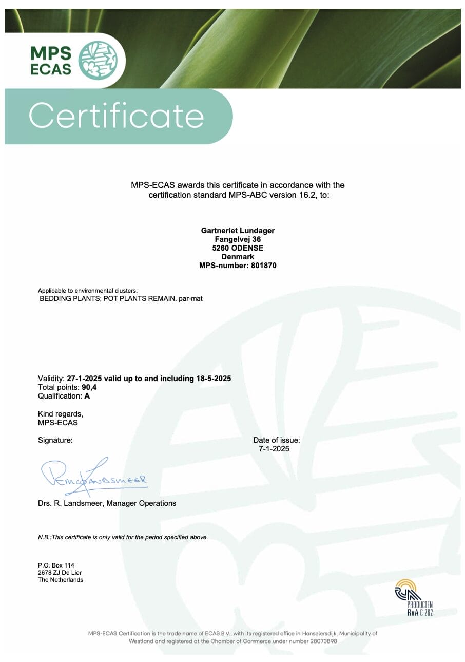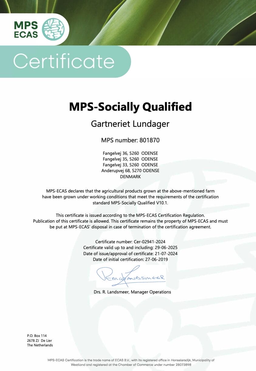 Z dumą dzielimy się naszym zaangażowaniem w zrównoważony rozwój, jakość i odpowiedzialne praktyki. Na tej stronie można znaleźć nasze certyfikaty dla Gartneriet LUNDAGER, w tym MPS, MPS GAP i MPS SQ. Nasz numer MPS dla LUNDAGER to 801870.